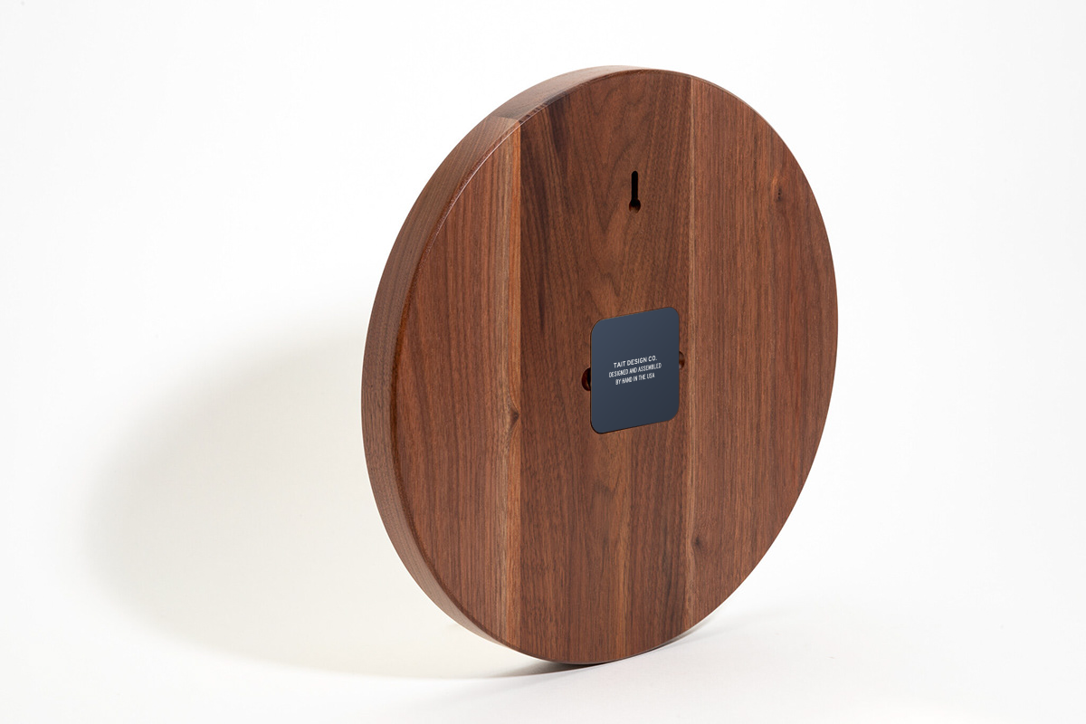 Hand crafted from solid walnut that’s sustainably sourced in the USA. Just like in nature, the wood on each clock varies from piece to piece. Two layers of mineral oil are applied by hand to each body, increasing the longevity of the wood’s pristine condition. The body measures 14” in diameter and 1.25” thick.